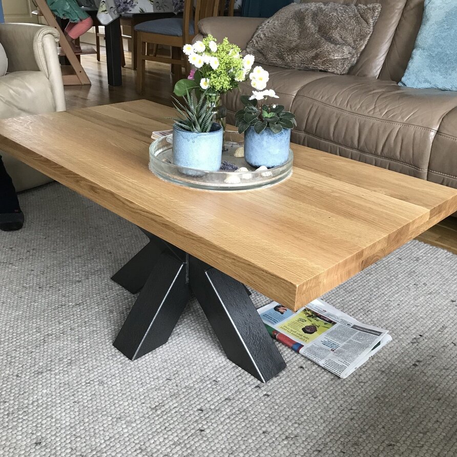 Leimholz Eiche (für innen) nach maß - Massivholzplatte aus A-Qualität (A/B) Eichenholz HF 8-12% - 4 cm stark (2-lagig) - mit durchgehenden Lamellen - Optional: Behandelt (Öl / Lack), mit Stahlprofilen, mit Tischplatte Kanten & Oberfläche gebürstet. Lesen Sie mehr
