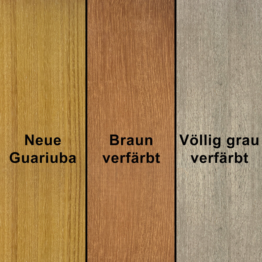 Guariuba Profilholz, unbehandelt & gehobelt, sind für den Außenbereich geeignet, haben eine relativ glatte Oberfläche und werden als Bauholz geliefert. Profilholz in gehobelter Ausführung sind - verglichen mit sägerauem Guariuba Holz - relativ formstabil mit einer identischen Stärke (Dicke) über die gesamte Länge. Sie sollten jedoch immer geringfügige Maßabweichungen wegen des Quellens und Schwindens von Holz berücksichtigen. Guariuba Profilhölzer werden standardmäßig grob (mit einer Kettensäge) auf Länge geschnitten und mit 1-2 cm Überlänge geliefert. Es gibt eine Ansichtsseite, die Rückseite kann etwas rauer sein und könnte Fehler aufweisen. Bitte beachten Sie: Guariuba Holz ist relativ schwer zu bearbeiten, aufgrund ihrer enormen Holzhärte kann das Bohren & Sägen schwierig sein.